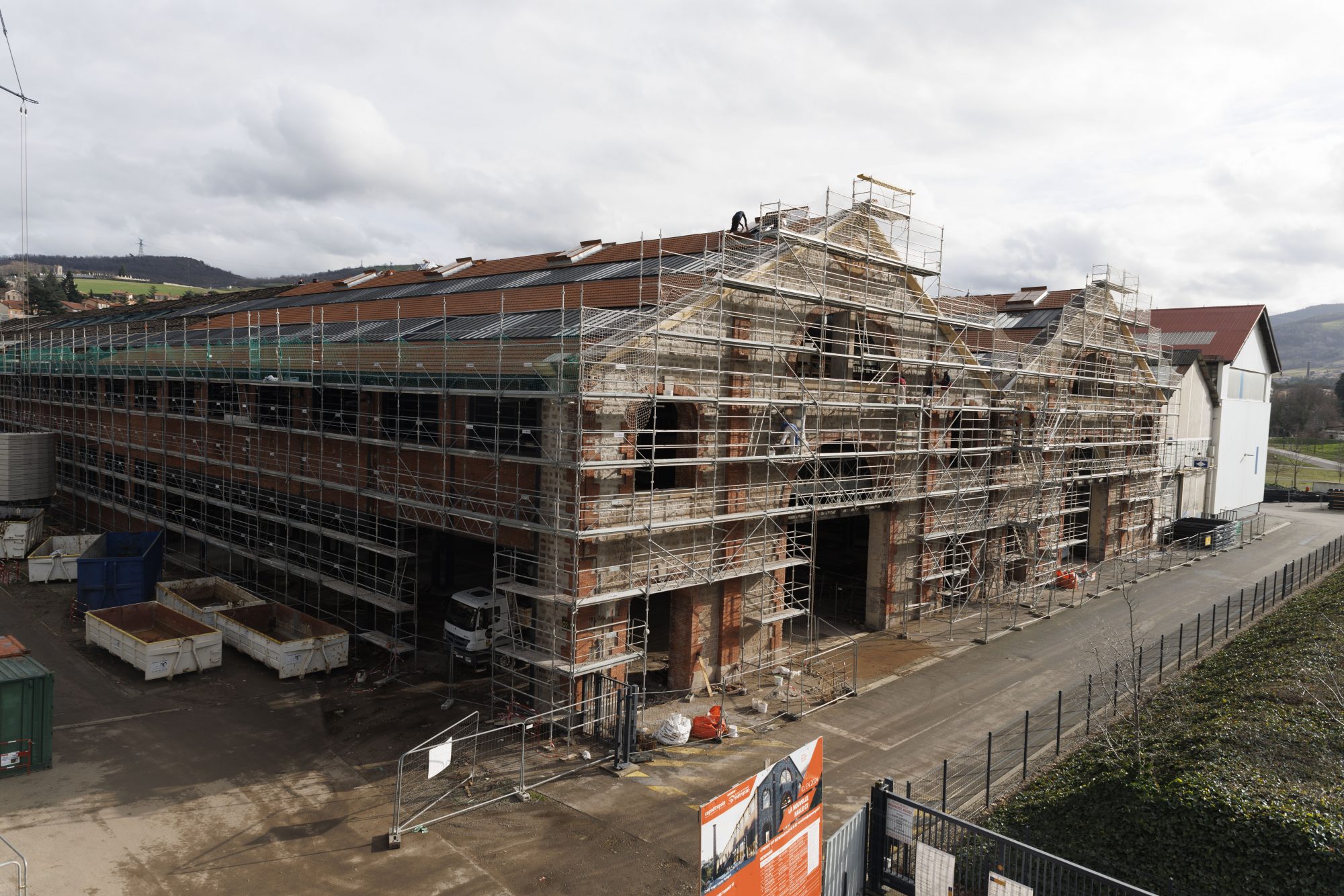En premier lieu, la rénovation thermique et la réorganisation du « bâtiment 59 » (pilotage de la maîtrise d’œuvre : NOTUS) qui accueille les activités de restaurant de LSR (Atelier Nova et Cantine Nova), celles-ci se poursuivant dans de bonnes conditions au cœur d’un chantier d’ampleur. Mise en place de nouvelles façades, isolation, installation de nouveaux réseaux, réaménagement complet du niveau inférieur et de l’étage, installation d’un nouveau système de chauffage, réorganisation du parking privatif… autant d’actions qui permettront de poursuivre les activités de restauration avec de belles perspectives et d’accueillir de nouveaux usages à tous les étages.