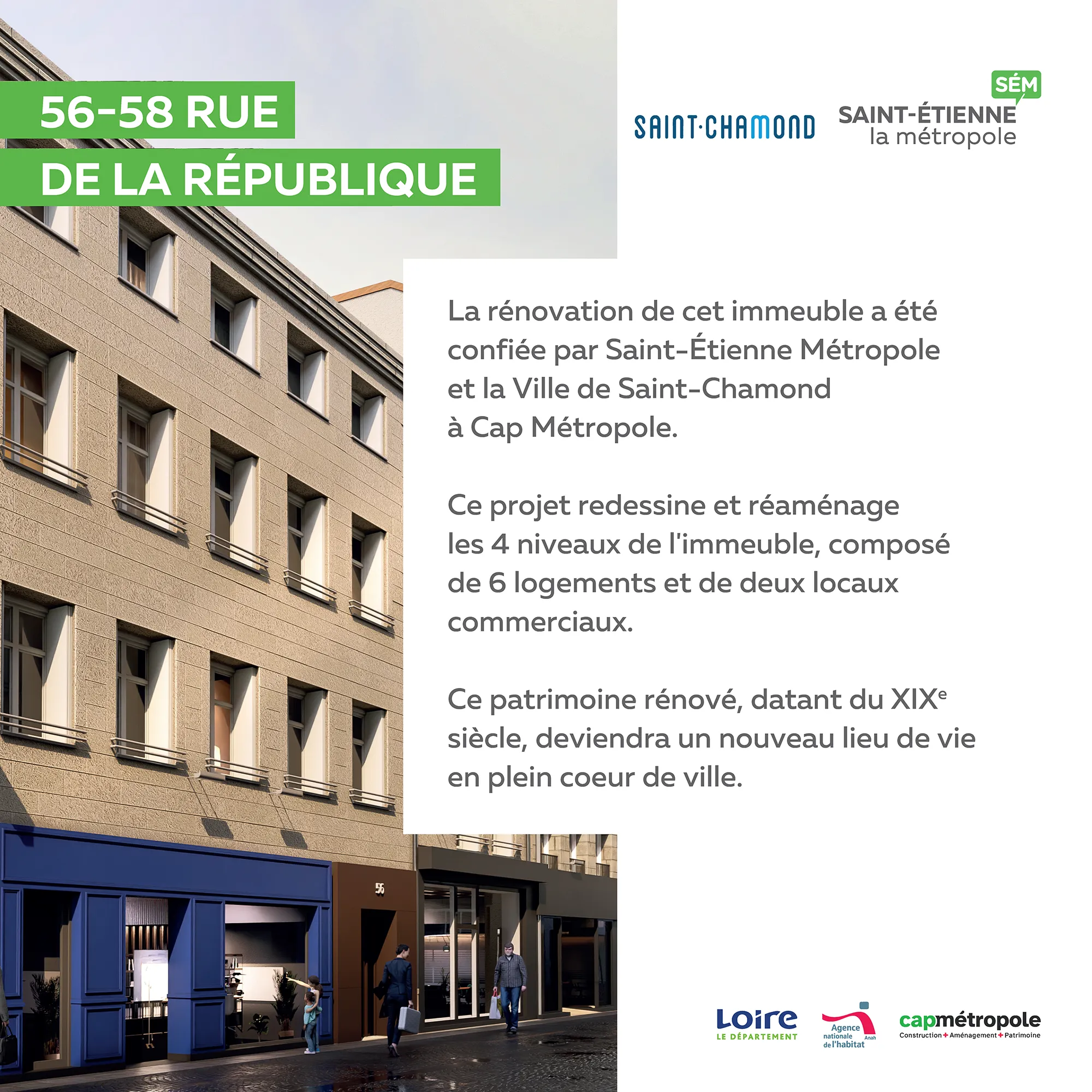 Après s’être rendue propriétaire de l’immeuble et avoir réalisé d’importants travaux, Cap Métropole propose à la vente au 56-58 rue de la République à Saint-Chamond :